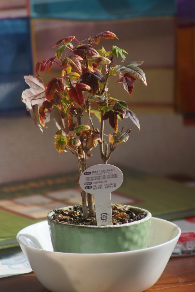 後ろのカラフルなカーテンと,紅葉している楓がよく合います.